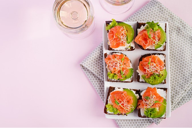 Na kostičky celozrnného chleba namažeme lučinu, ozdobíme uzeným lososem a avokádem (aby nám avokádo nezčernalo, je důležité ho osolit a pokapat citrónem nebo limetkou). Kdo má rád kopr, může dozdobit čerstvým koprem nebo mungo klíčky.