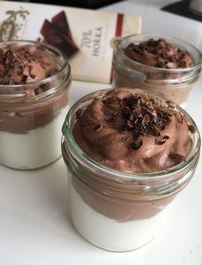 - Polovinu bílého tvarohu dáme do skleniček a do zbylé poloviny vmícháme rozehřátou čokoládu.